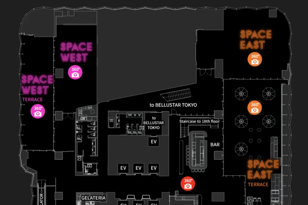イベントスペースは、KABUKICHO TOWER STAGE、オープンスペース Northwest/Northeast、ビル内のフロア (17階、18階)の3つです。